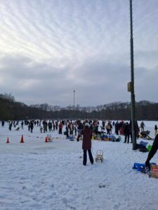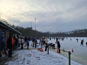 De ijsbaan (krabbelbaan en 400 meter) zijn op 11 januari van 13.00 tot 18.00 uur open geweest. Geheel onverwacht bleek het ijs ’s ochtends toch dik genoeg om iedereen uit te nodigen voor een middagje ijspret. Eerst leek de sneeuw de grote spelbreker te zijn, maar met een extra nachtje strenge vorst en wat extra aandacht van onze ijsmeesters kon het toch doorgaan.
